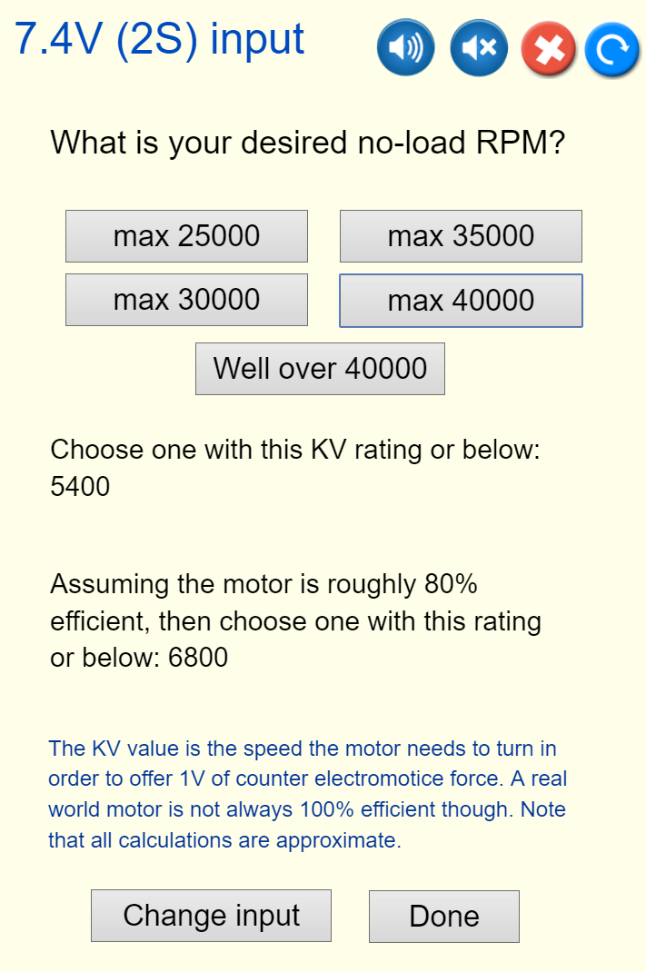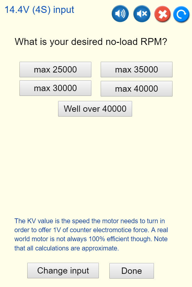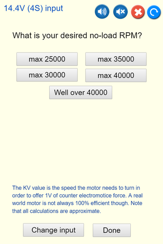 The KV value is the speed the motor needs to turn in order to offer 1V of counter-electromotice force. A real world motor is not always 100% efficient though. Given the wide range of possible battery configurations, you want to choose a motor with a KV rating that can optimize the performance of your RC model. This app lets you quickly choose a rating that can achieve your desired performance in rpm.